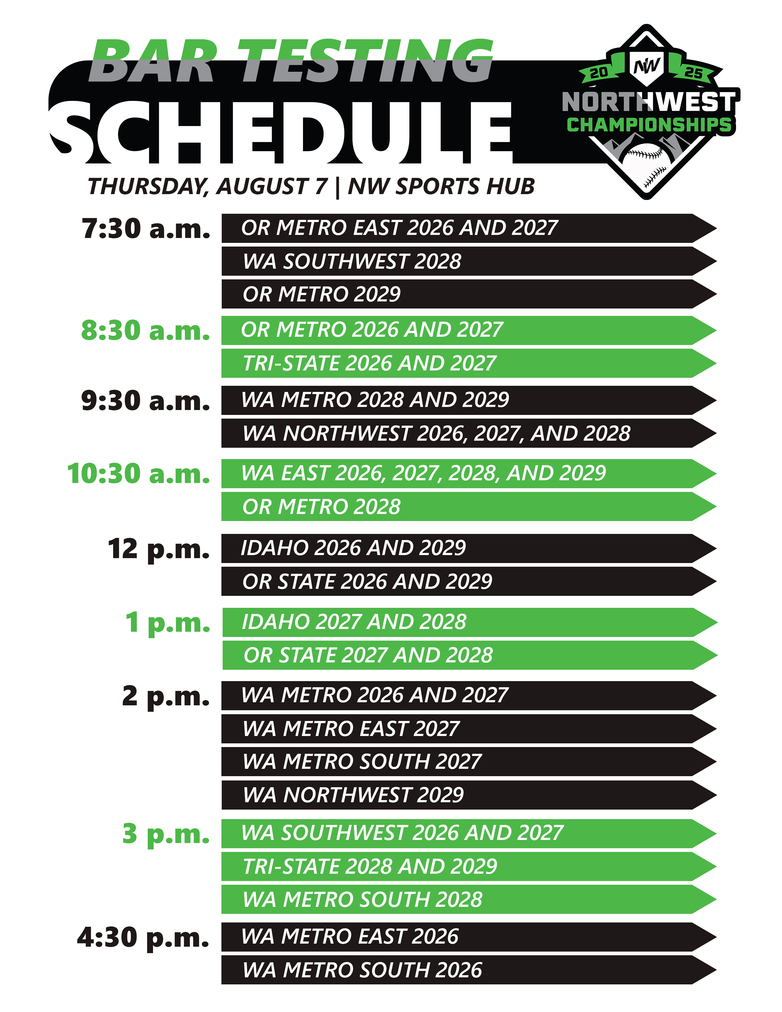 All teams will meet your coach inside the NW Sports Hub at your assigned check-in time (look for the sign with your grad year). Your coach will give you your jersey and hat. Your coach will then direct you where to go for BAR Testing. You will play one game on Thursday, after BAR testing.